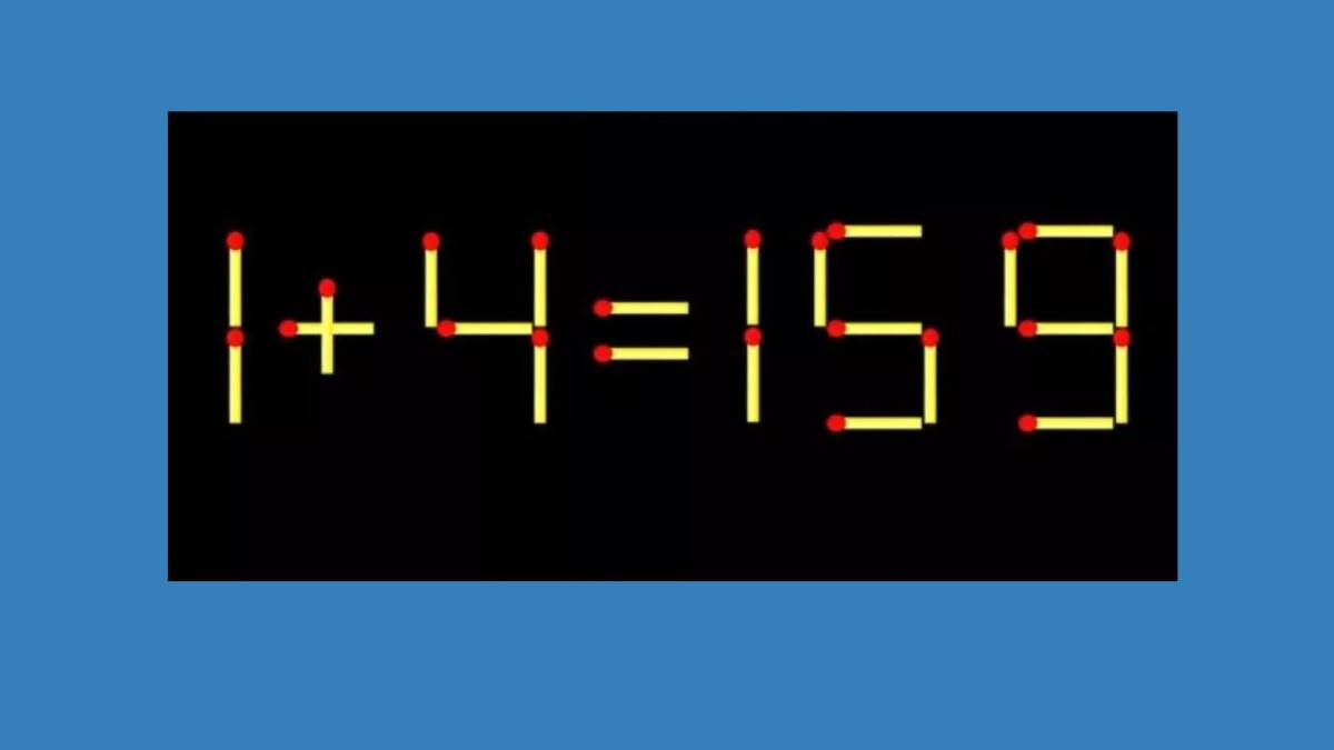 Обратите внимание на иллюстрацию. Перед вами пример «1+4=159», составленный с ошибкой. Переставьте всего одну спичку в записи, чтобы равенство стало верным. Уложиться нужно за 9 секунд.