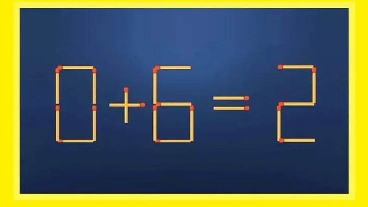 Посмотрите внимательно на иллюстрацию. Перед вами равенство «0+6=2», в котором допущена ошибка. Необходимо сделать запись верной, переставив всего одну спичку. Сконцентрируйтесь на примере.