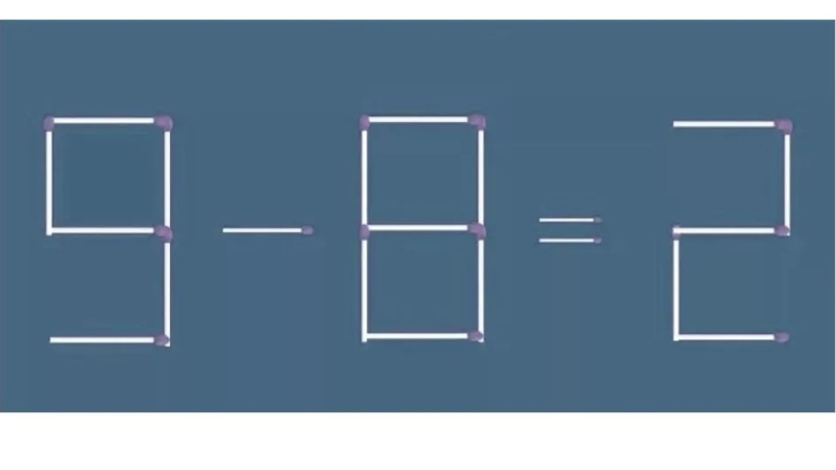 Посмотрите на иллюстрацию, перед вами равенство «9-8=2». В пример закралась ошибка, для исправления которой необходимо переставить одну спичку в этой записи. Думайте быстрее!