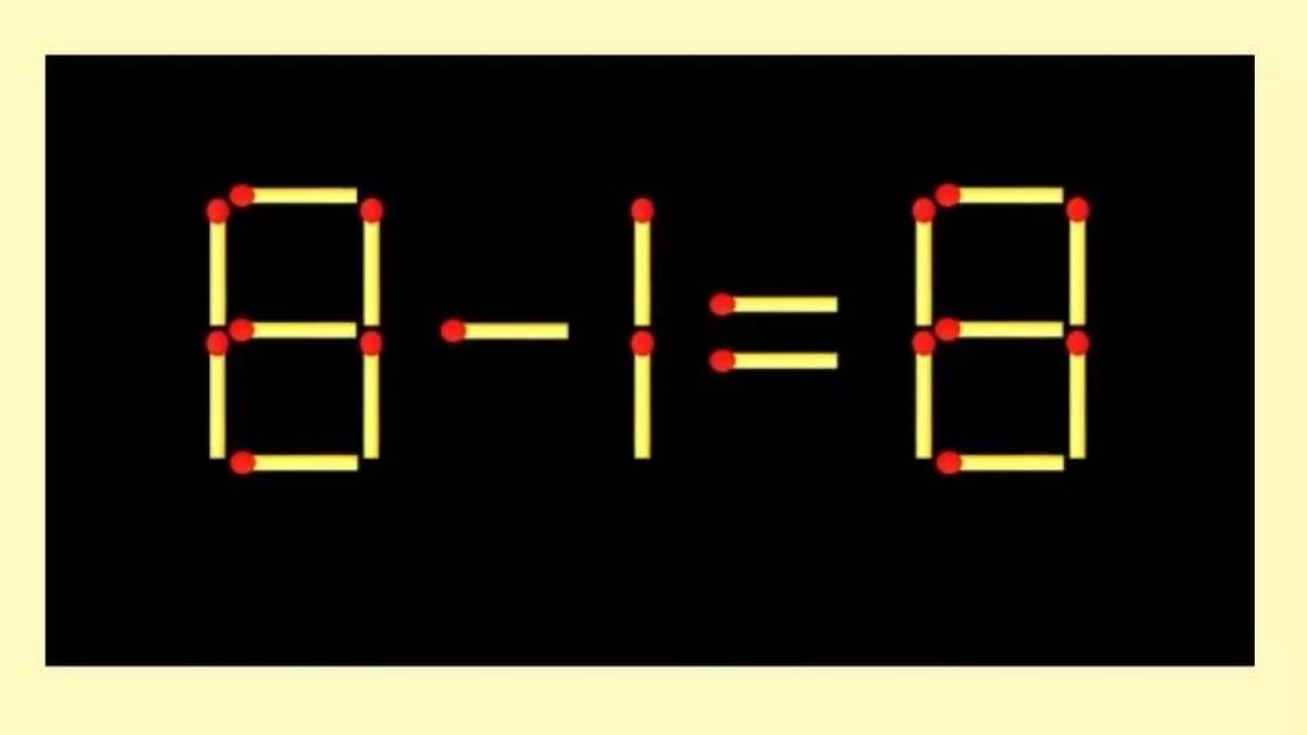 На иллюстрации показано неверное равенство «8-1=8». Пример составлен из спичек, исправить его будет не так-то просто. Разрешается передвинуть всего одну палочку в записи, уложиться нужно за 12 секунд.