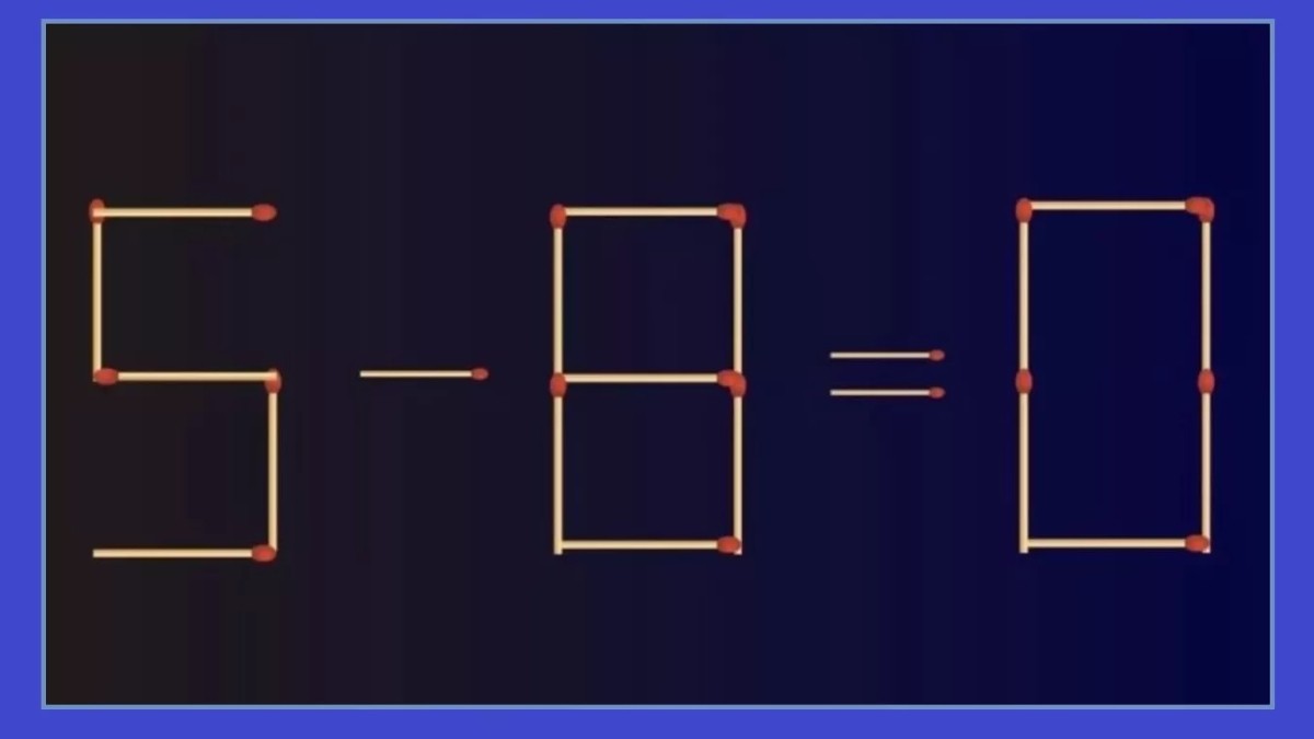 Посмотрите на нашу иллюстрацию. Перед вами неверное равенство «5-8=0», в котором необходимо исправить ошибку. Переместите всего одну спичку так, чтобы арифметика не страдала.