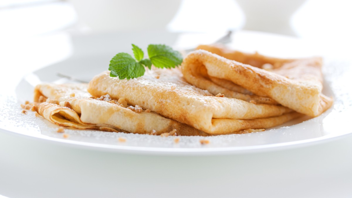 Снимаю блин, разрезаю на четыре части и каждый кусочек сворачиваю трубочкой. Получается примерно два-три блина, самое то на завтрак. А начинку можно и поменять, даже сладкую сделать.