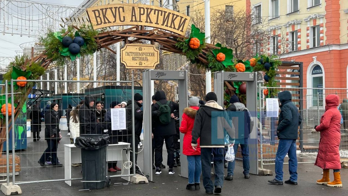Сегодня на улице Воровского в Мурманске открылась ярмарка «Вкус Арктики», однако попасть на неё не так-то просто — перед входом гостей ожидает досмотр, который проводится сотрудниками полиции.