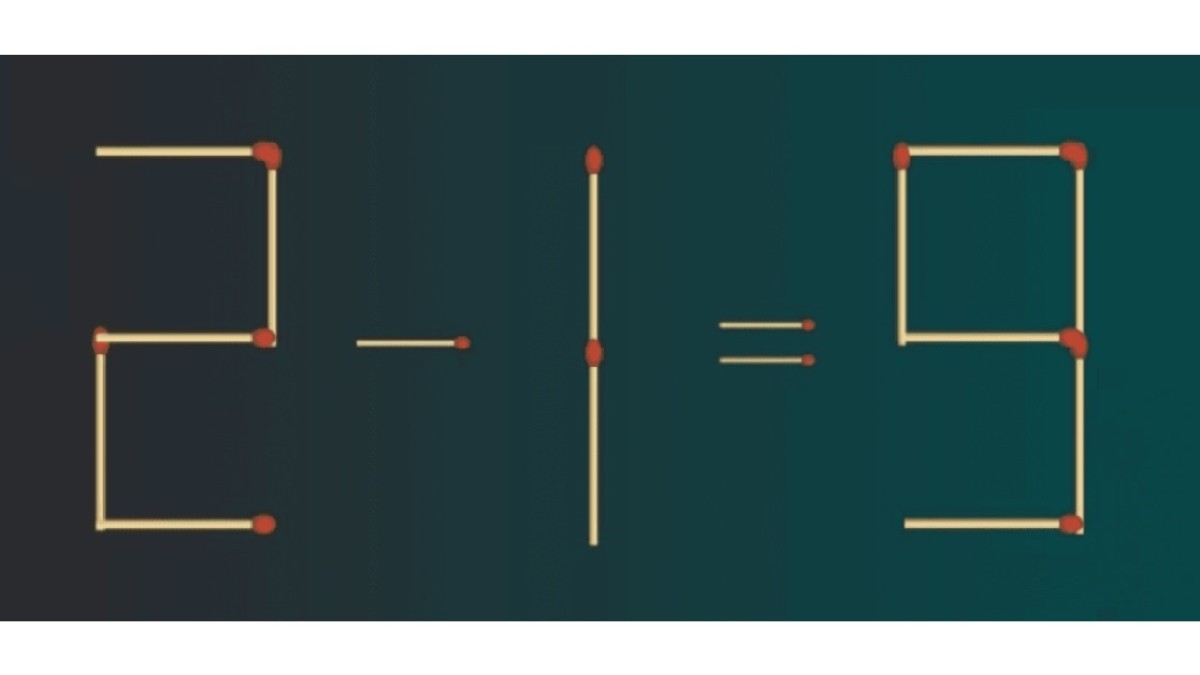 Обратите внимание на иллюстрацию, перед вами равенство «2-1=9». Конечно, в примере допущена ошибка, которую необходимо исправить. Для этого разрешается передвинуть всего одну спичку, скорее за дело.