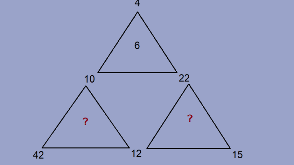 В каждом треугольнике три числа по углам и одно в центре. Ваша задача догадаться, по какому принципу оно вычисляется.