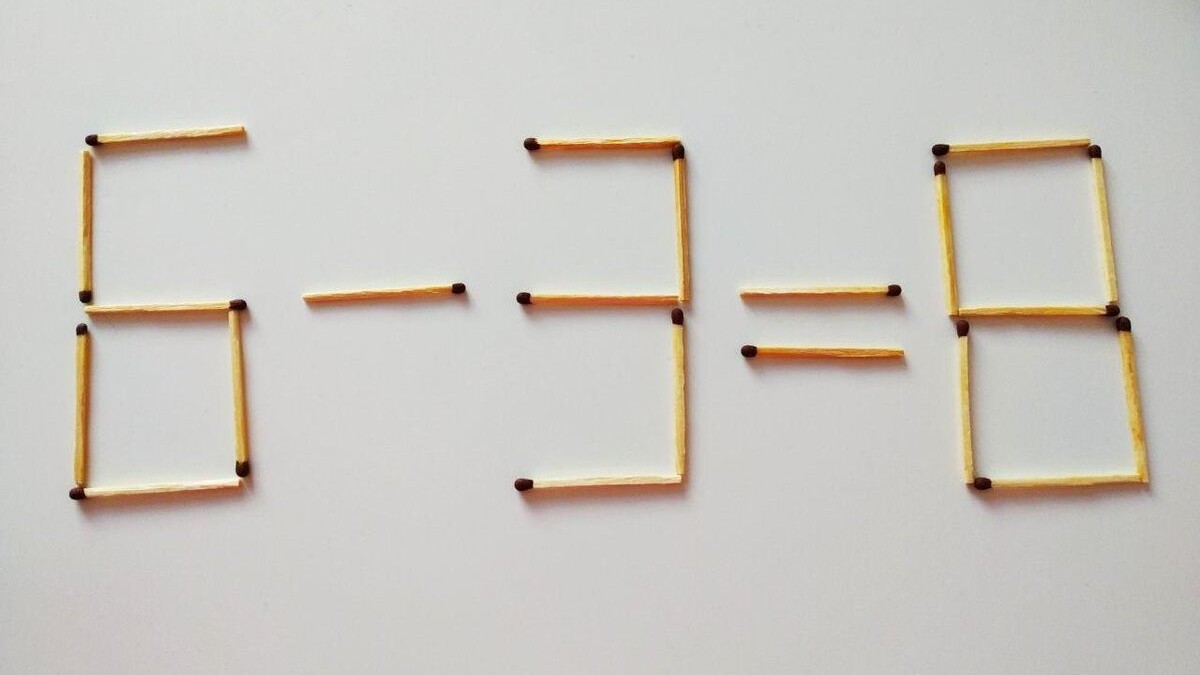 Всё гораздо проще, чем вы думали. Из знака — делаем плюс, а лишнюю спичку переставляем из результата уравнения, делаем из цифры 8, цифру 9.