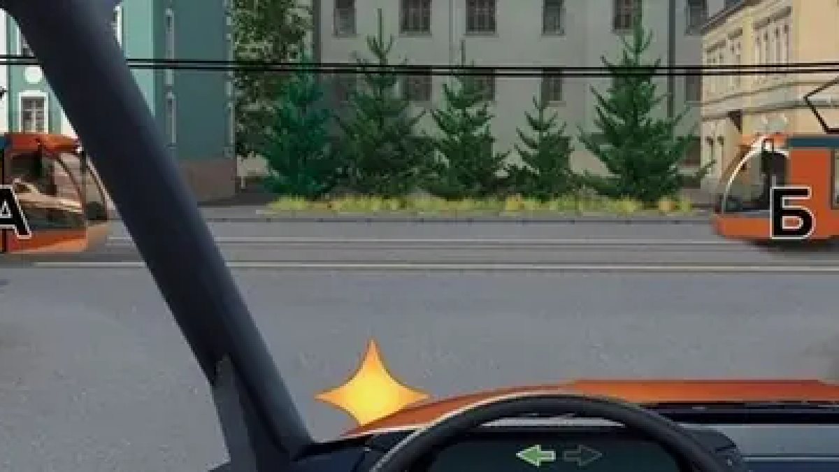 Машина, два трамвая, главная дорога. А кому проезжать первым, непонятно.