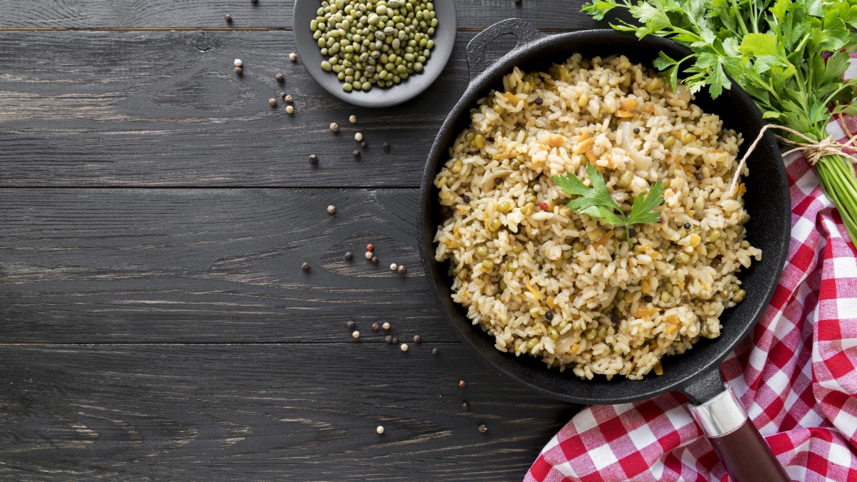 Сначала я пожарила рис с куркумой и солью, потом залила горячей водой и оставила вариться под крышкой. Пока рис доходил, взбила яйца со сметаной, добавила нарезанные помидоры и зелень. Ну и посолила-попчерчила, понятное дело