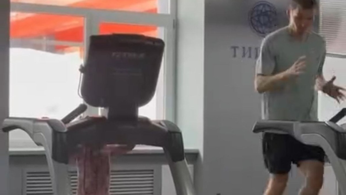 На тренировку перед соревнованиями спортсмен вышел вместе со своей двухлетней дочерью Евой — девочка с радостью присоединилась к разминке на беговой дорожке.