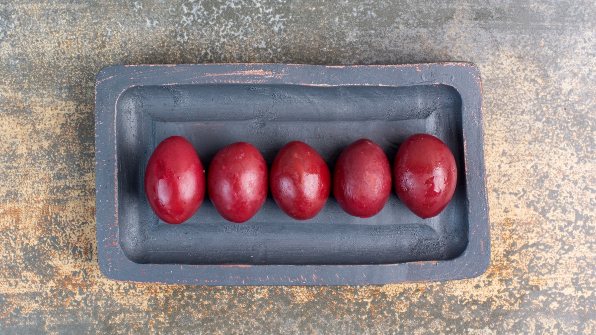 Многие красят яйца свеклой, но есть способ попроще и приятнее. Для глубокого бордового оттенка лучше выварить яйца в гранатовом соке.