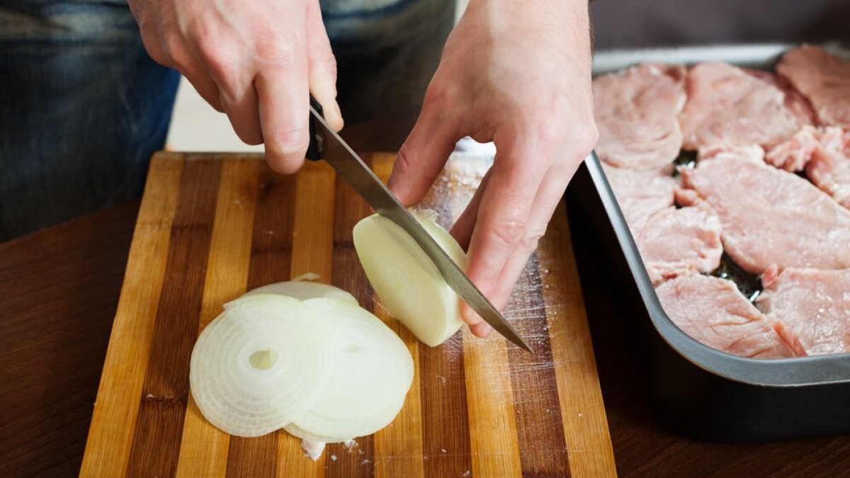 Лук в мясо по-французски лучше нарезать довольно мелко. А чтобы избавиться от горечи лука, нужно замочить его в кипятке на 10–15 минут. Лук надо выкладывать и под мясо и поверх мяса, так все лучше пропитывается.