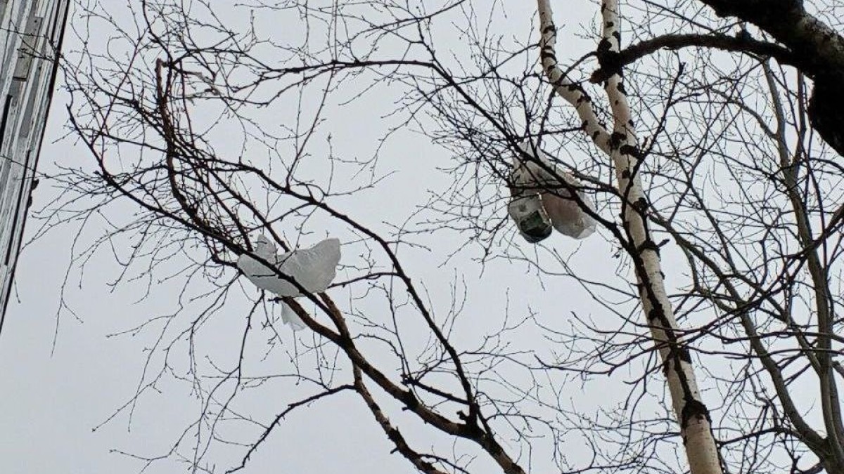 На улице Заречной в ЗАТО Видяево (Мурманская область) царит немыслимый хаос — отдельные участки пешеходных дорожек погребены под горами мусора, а на деревьях вместо птиц «красуются» использованные памперсы.