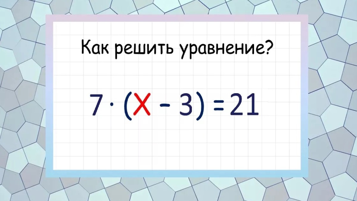Вам на пробу мы приготовили классическое уравнение. Взгляните на иллюстрацию, необходимо найти «икс» в уравнении 7(Х-3)=21. Сконцентрируйтесь секунд на 15, и начинаем проверять.
