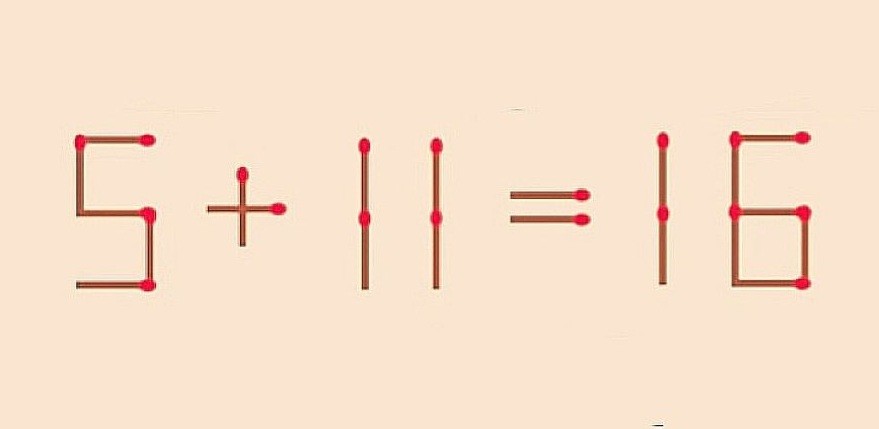 Показываем решение, если вы не довольны своим результатом. Можно трансформировать число «7» в «11», хитро передвинув одну палочку. Получилось верное равенство «5+11=16», прекрасно.
