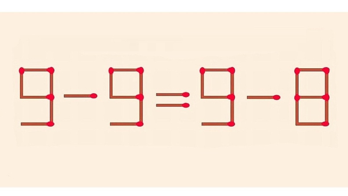 В нашем распоряжении оказалась задачка на перестановку спичек, популярная тренировка пространственного мышления. Взгляните внимательно на иллюстрацию. Перед нами неверное равенство «9-9=9-8»