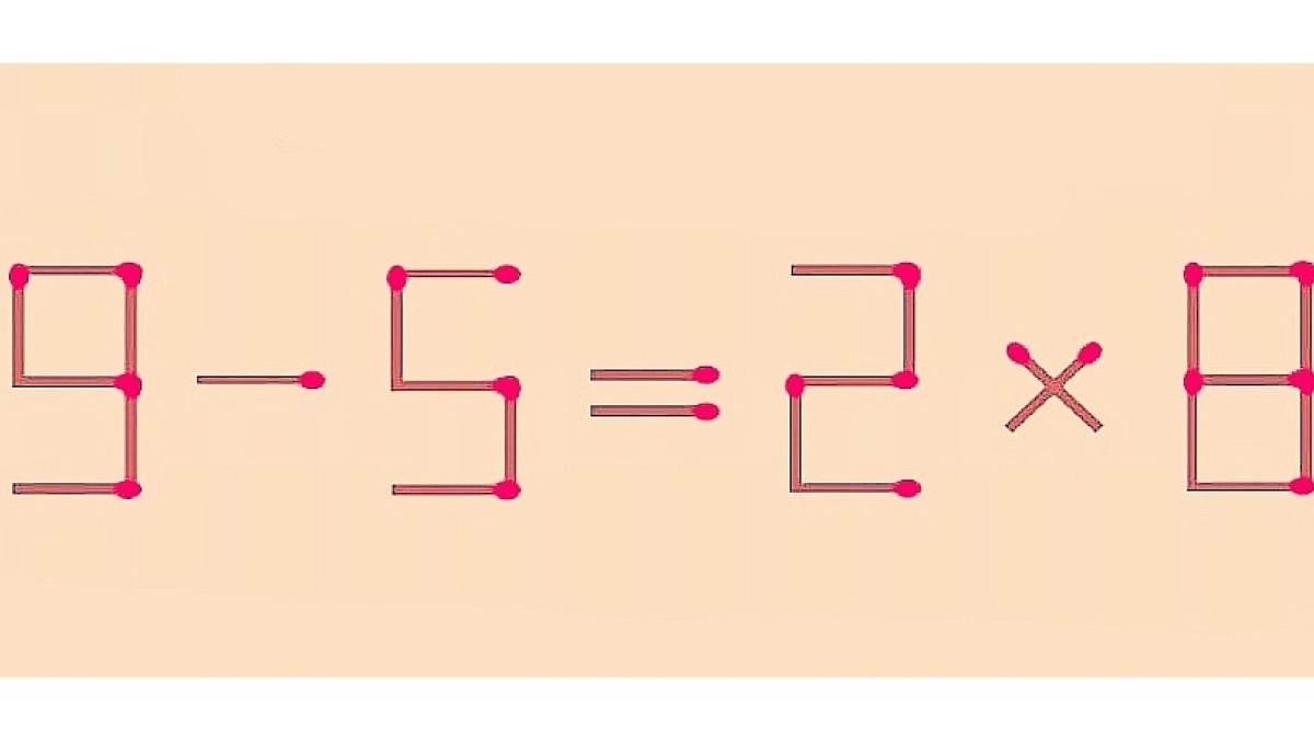 На иллюстрации показано равенство «9-5=2×8». В пример закралась ошибка, для исправления которой необходимо передвинут одну спичку. Мастерам логического мышления не потребуется на решение более 10 секунд.