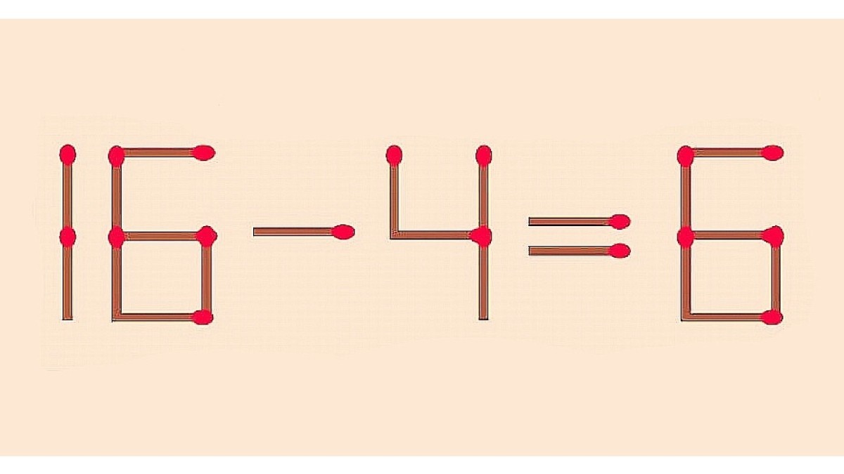 Внимание на иллюстрацию, перед вами неверное равенство «16-4=6». Постарайтесь исправить ошибку в примере, передвинув всего одну спичку в записи, остальные палочки ломать и убирать нельзя, всё строго.