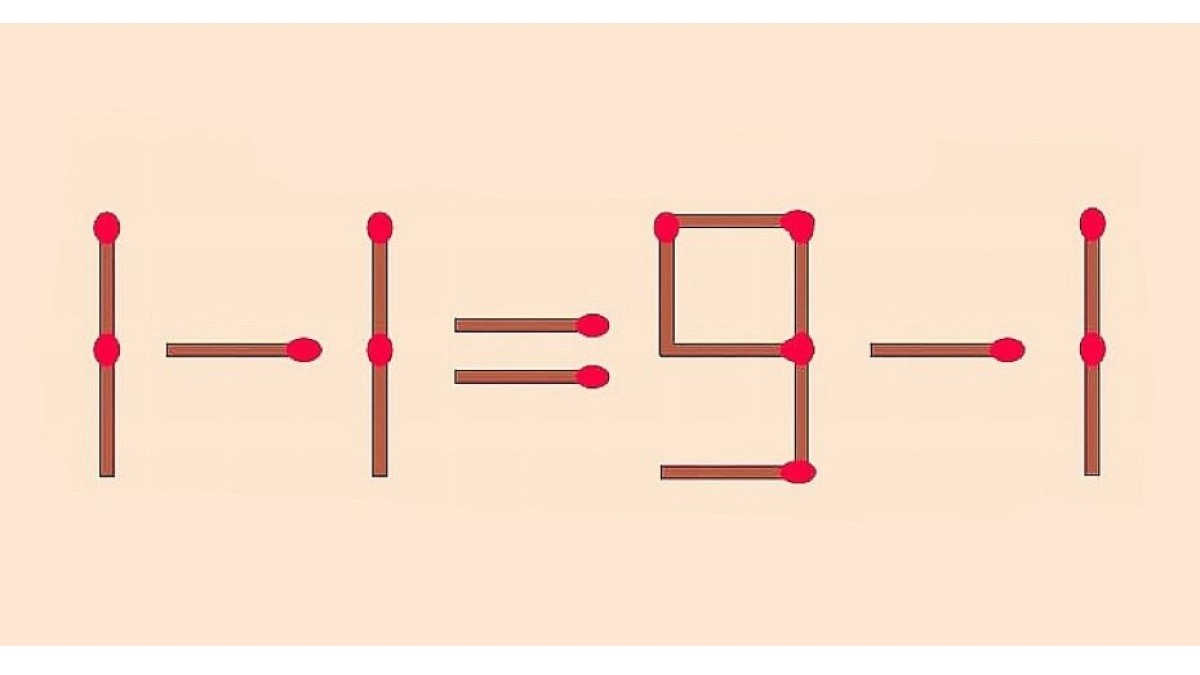Можете ознакомиться с верным решением на рисунке. Следует забрать спичку из цифры «9», чтобы превратить первое вычитание в сложение. У нас получилась верная запись «1+1=3-1», и вы не отставайте.