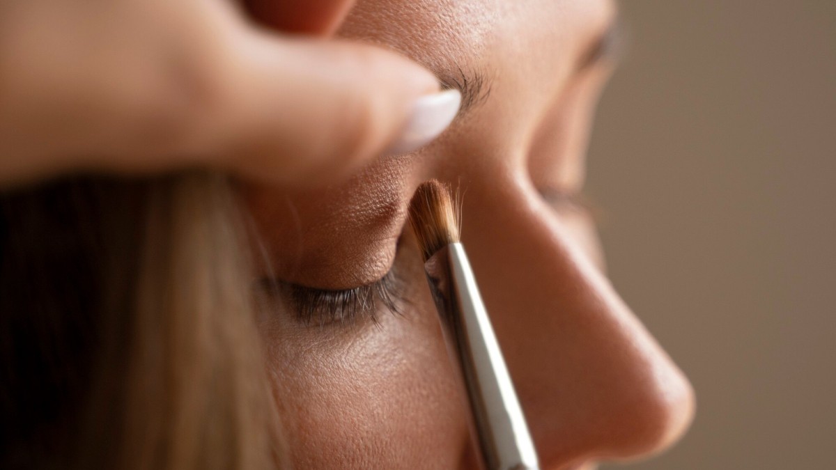 Используя пушистую кисть и тени, обозначаем складку века.