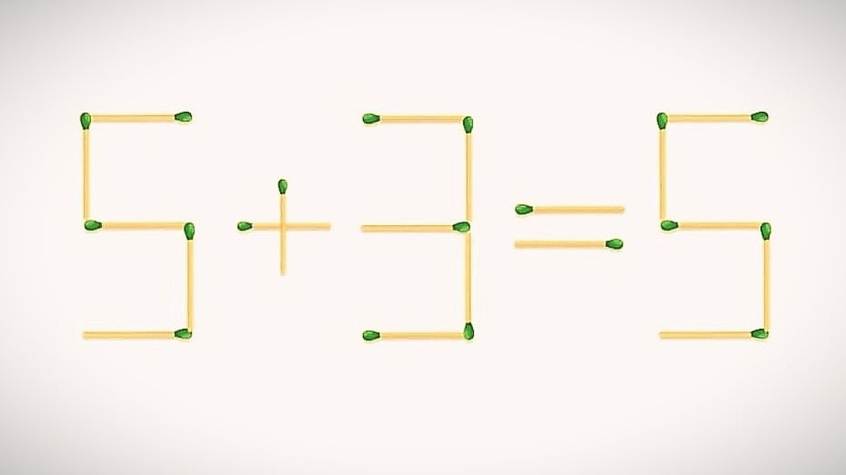 На иллюстрации представлена запись «5+3=5». В равенство закралась ошибка, потребуется передвинуть две спички, чтобы пример стал верным. Остальные спички нельзя убирать или ломать, всё просто.