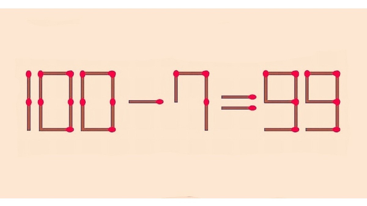 На иллюстрации для вас составлена спичечная головоломка «100-7=99». В равенство закралась ошибка, исправить которую поможет перестановка всего одной спички. Не отставайте от гениев, возьмите решение в свои руки.