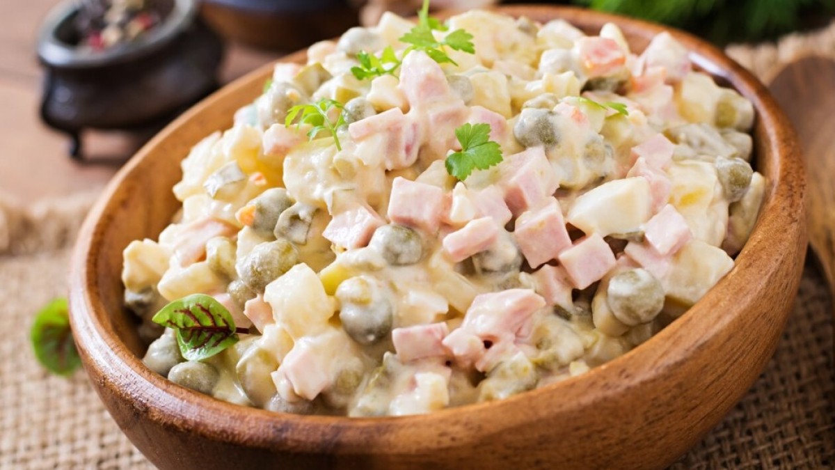 Салат следует залить приготовленной заправкой и все перемешать. Он чем-то напоминает «Оливье», но это совершенно другой салат. Вкусно — попробуйте.