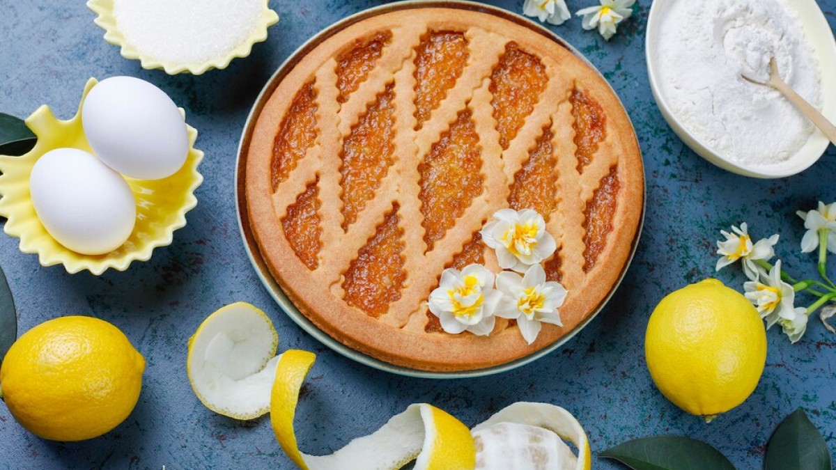 Для начала нам понадобятся вот такие ингредиенты. Для теста: 200 г муки, 100 г сливочного масла, 40 г сахара, яичные желтки — 2 шт., ванильный сахар — 10 г, соль — щепотка. Для крема: яйцо — 1 шт., сливочное масло — 50 г, сахар — 100 г, лимон (цедра и сок) — 1 шт.