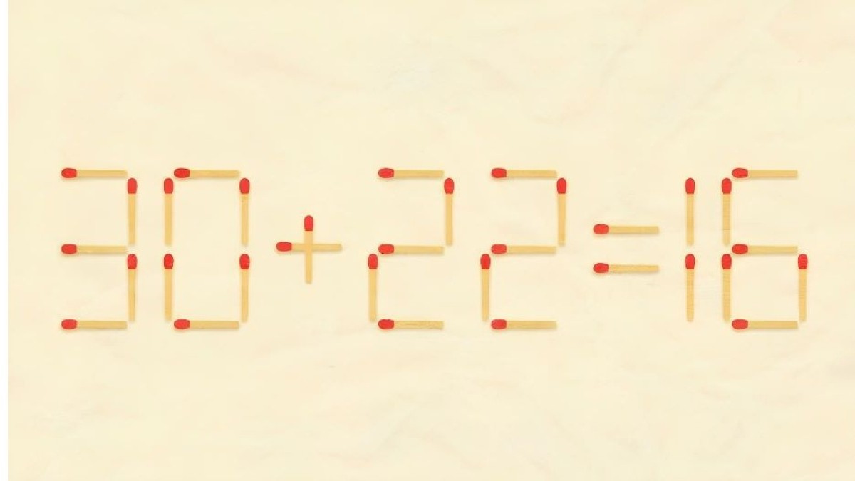 Внимательно посмотрите на иллюстрацию. Перед нами равенство «30+22=16», в которое закралась ошибка. Вам под силу восстановить справедливость, переместив всего одну спичку.