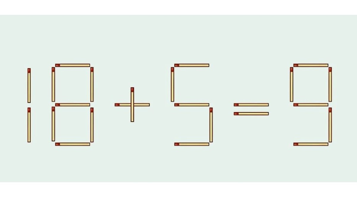 Представляем вашему вниманию спичечную головоломку. Взгляните на иллюстрацию, вот проблемное равенство «18+5=9». Ошибку в примере необходимо исправить, переместив всего одну палочку в записи, остальные спички лежат без изменений.