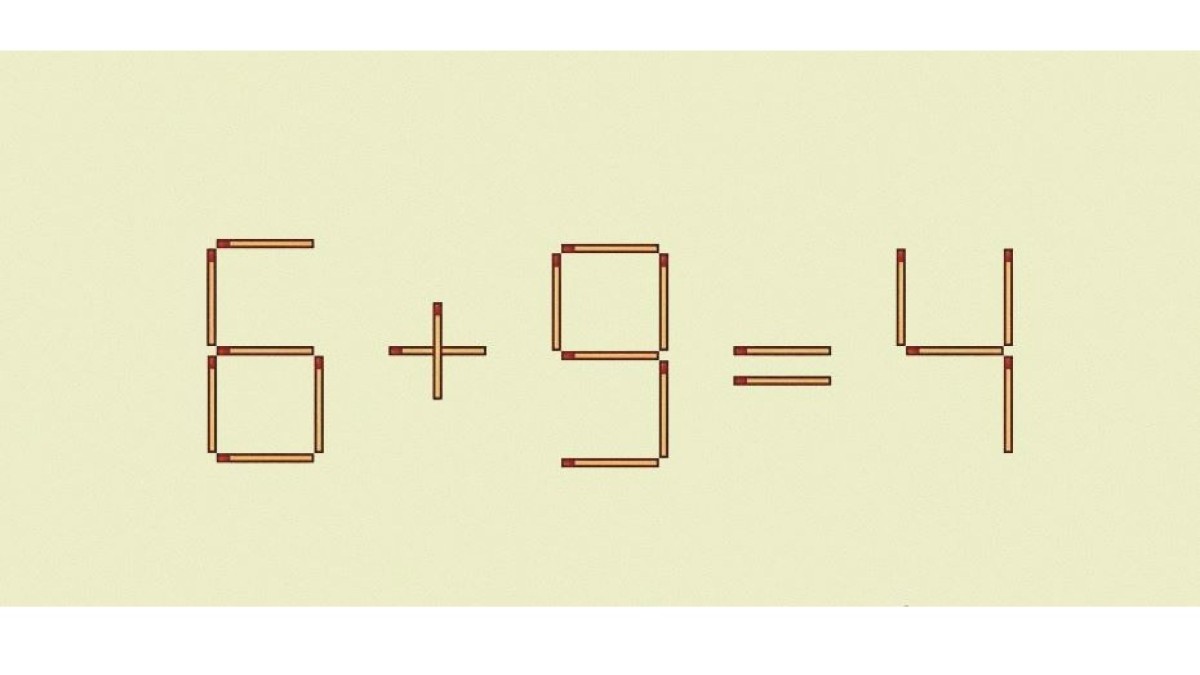 На иллюстрации показано равенство из спичек «6+9=4», ошибку в котором необходимо исправить. Выберите в этой записи одну спичку для перестановки, остальные элементы остаются без изменений.