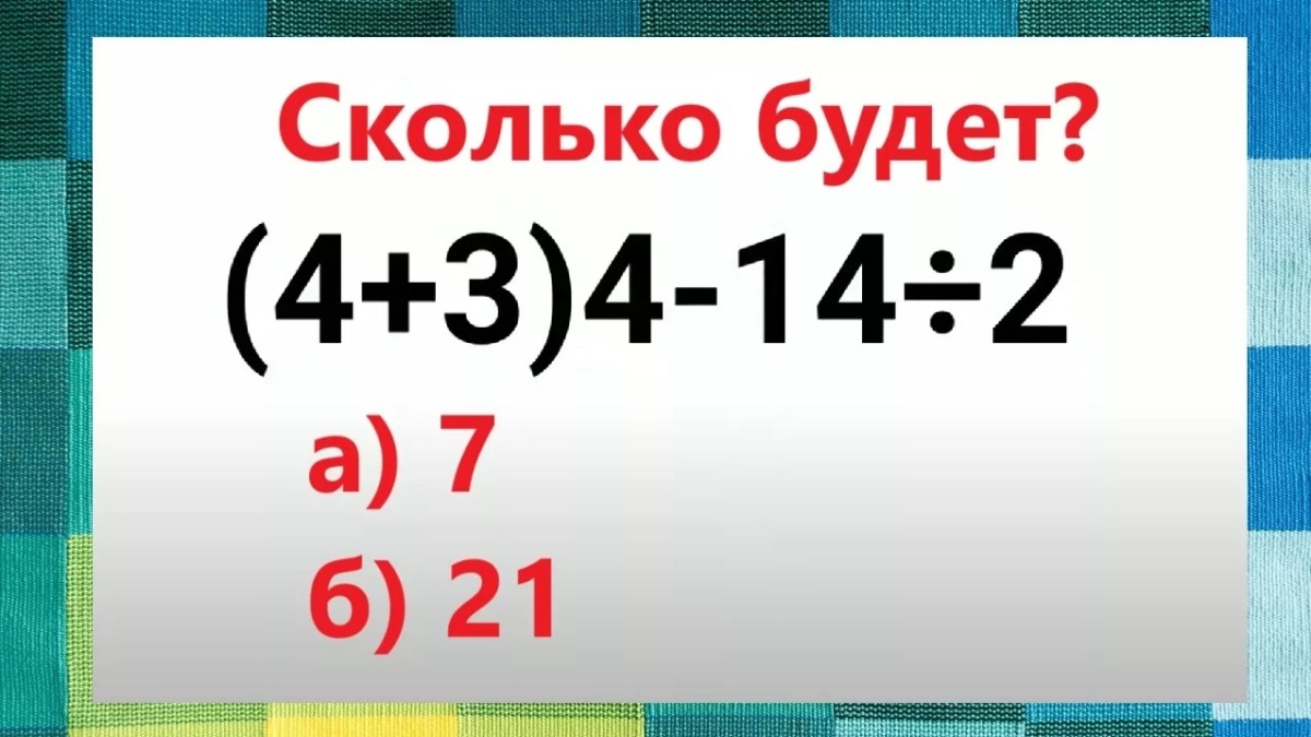 Начнём со сложения в скобках: 4+3=7. За ним выполняем умножение: 7×4=28. У нас есть ещё деление: 14:2=7. На закуску осталось вычитание, которое и станет ответом нашего примера: 28-7=21. Как видите, таблицу умножения не следовало забывать.