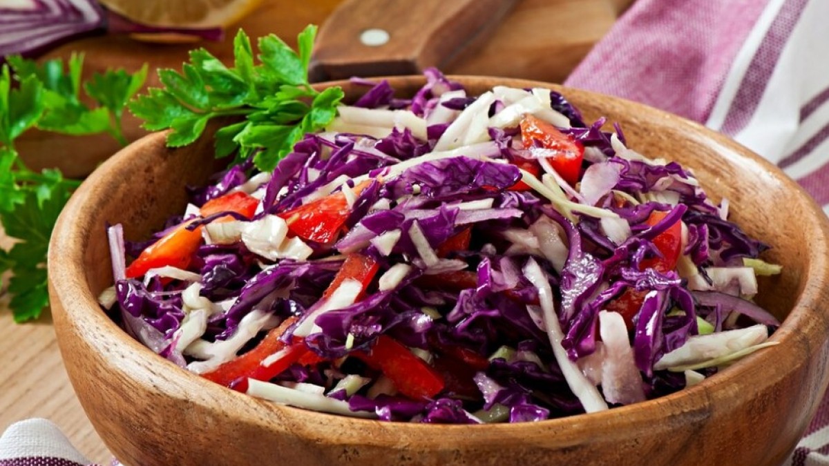 Салат делается из сырых овощей: капусты, моркови и свеклы. Их можно натереть на терке или нашинковать соломкой. Затем овощи следует полить лимонным соком, заправить зеленью, посолить.
