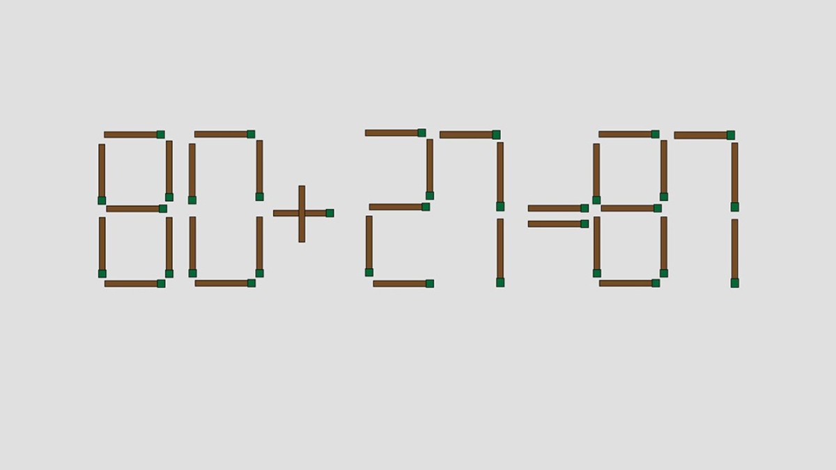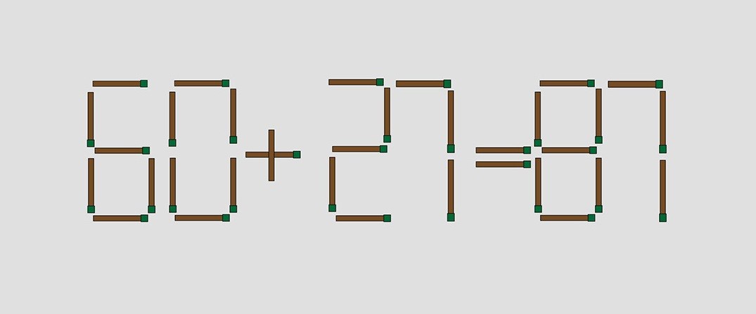 Взгляните на иллюстрацию, перед вами равенство «80+27=87», составленное из спичек. В примере кроется ошибка, вы исправите ситуацию, если уберете лишнюю спичку в этой записи.