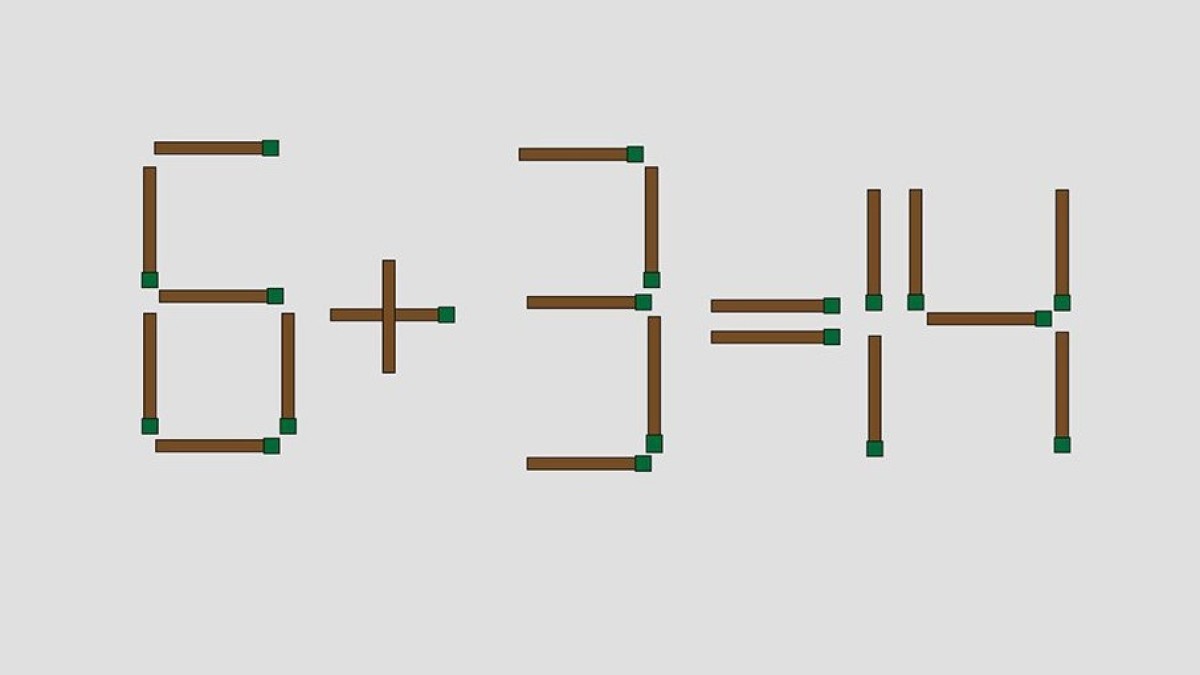 Внимание на иллюстрацию, перед вами равенство «6+3=14», составленное из спичек. В примере допущена ошибка, исправить которую следует перестановкой всего одной спички.