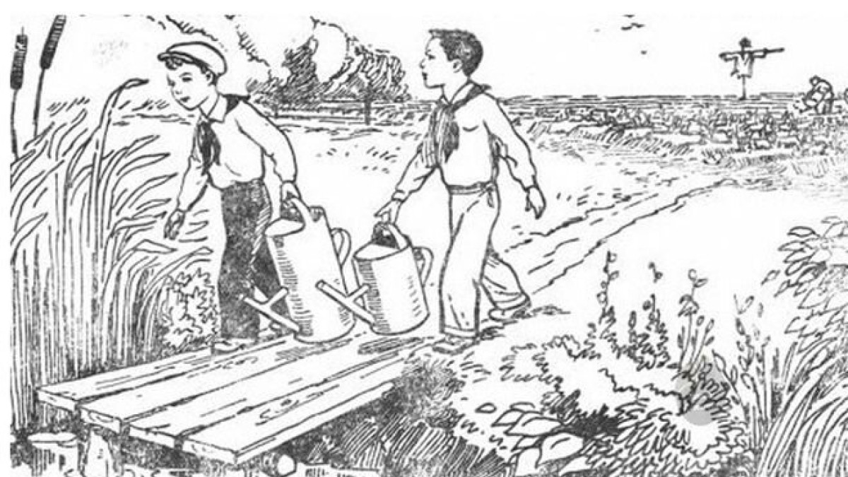 Посмотрите на картинку. Два мальчика собираются поливать огород. У них лейки с водой — одна выше, другая ниже. Кто из них сможет принести больше воды?