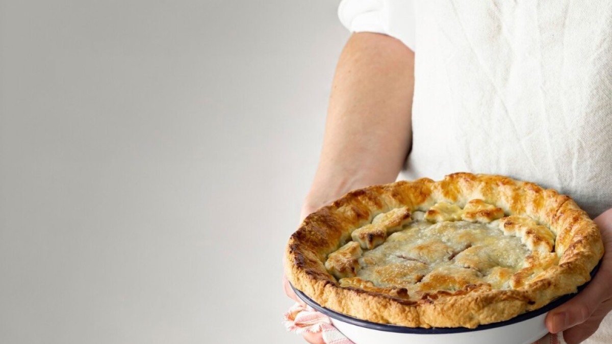 Тесто, охладившееся в холодильнике, нужно разделить на 2 части (верх и низ пирога) и раскатать. Первый пласт теста надо положить на низ формы, затем начинку, а сверху — второй пласт теста. Затем пирог нужно выровнять, а из обрезков теста сделать украшения.