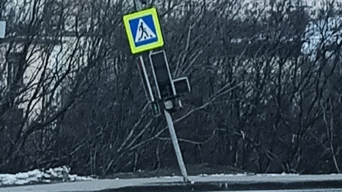 В североморском районе Авиагородок, в народе именуемом «Кишлаком», произошло ДТП с участием светофора, который, по всей видимости, стал «жертвой» проезжающего мимо автомобиля, заставившего его обернуться вокруг своей оси.