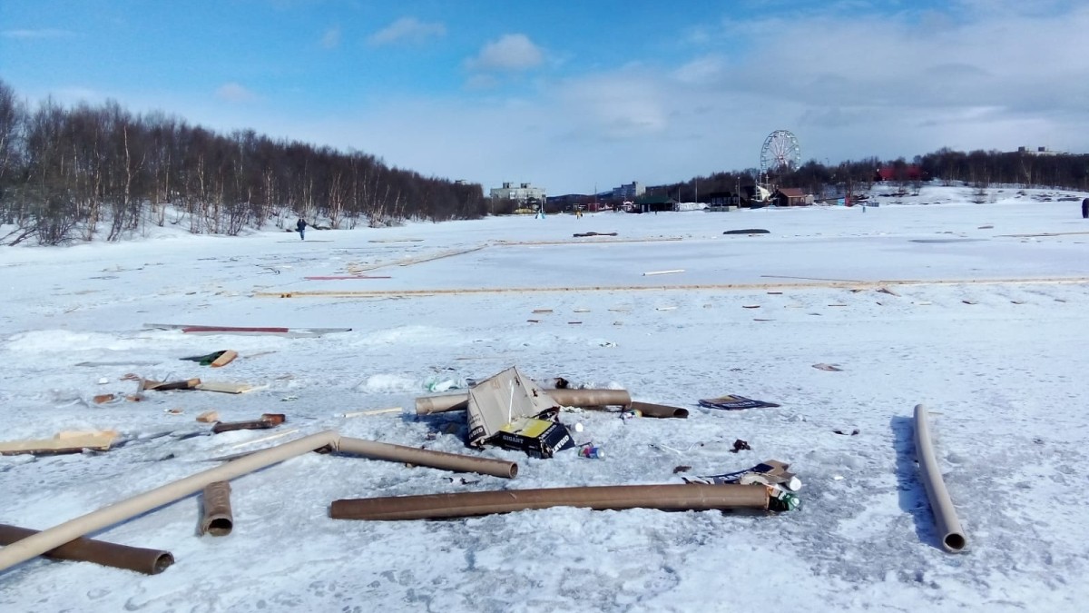 Последствия Чемпионата России по зимнему плаванию, проходившему на Семёновском озере в Мурманске более месяца назад, вызывают массу недовольства среди горожан — на берегу и поверхности водоёма по-прежнему разбросан мусор в виде деревянных досок, ковровых покрытий и прочего забытого инвентаря.