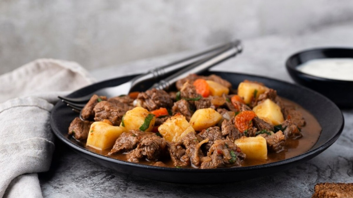 Вкус подливы у этого блюда просто невероятный — бархатный, с богатой палитрой ароматов с легкой ноткой вина и привкусом жареного лука. Она получается густой, почти кремовой, и придает изюминку гуляшу. Мясо очень мягкое, сочное.