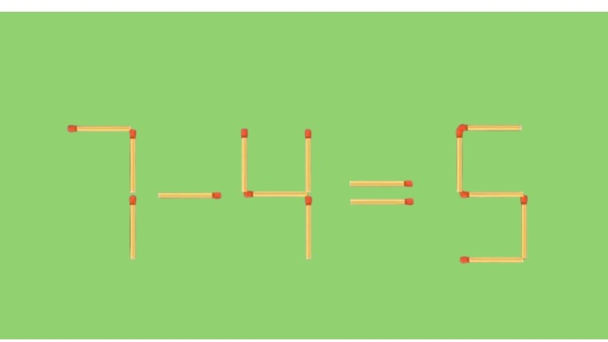 Внимательно посмотрите на иллюстрацию, перед вами неверное равенство «7-4=5». Пример составлен из спичек, потребуется переместить одну из них, чтобы равенство стало верным. Только знаний арифметики здесь не достаточно, подключите пространственное воображение.