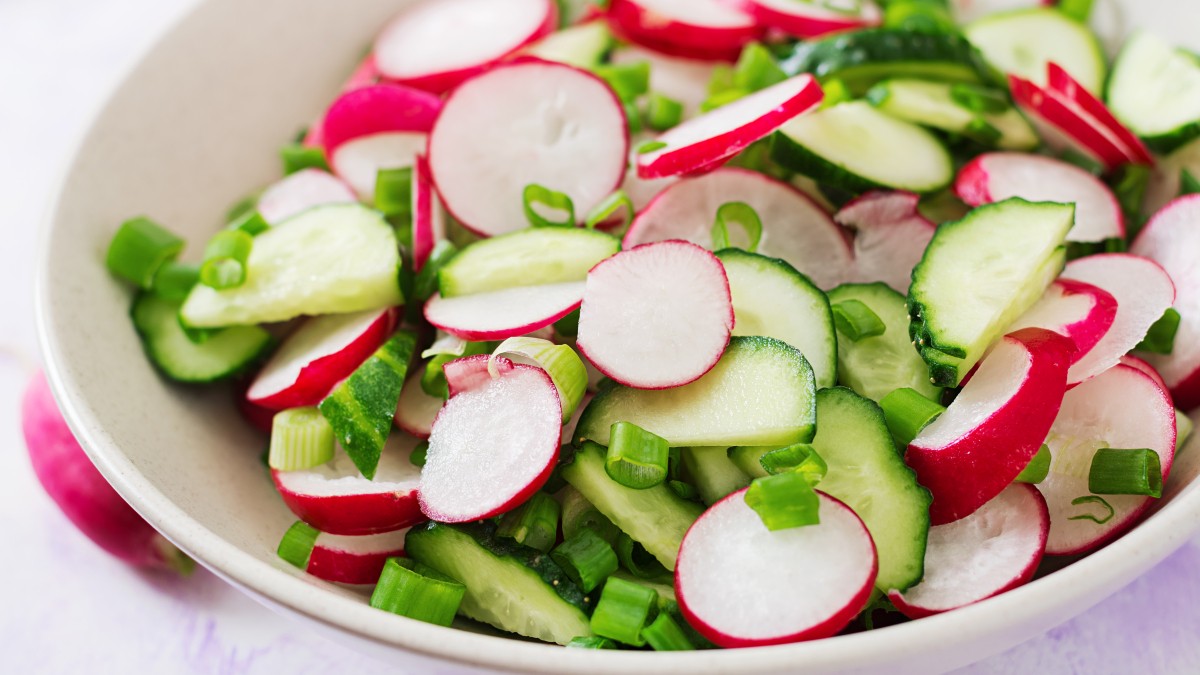 Попробуйте салат с молодой картошкой. Отварите её и порежьте кубиками. Добавьте тонко резанный редис, маринованные огурцы и лук. Заправьте сметаной с горчицей. Получится очень сытно и ароматно.