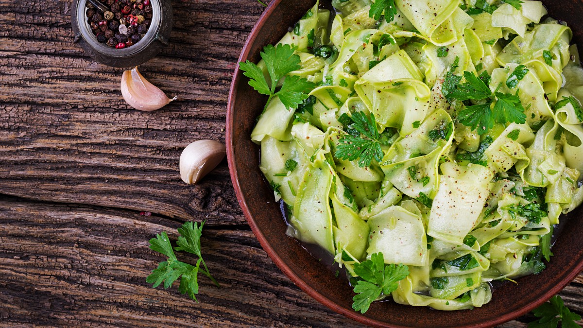 Для салата берут молодые кабачки и морковь. Их натирают на специальной тёрке для корейской моркови. Лук режут тонкими полукольцами, чеснок мелко трут.