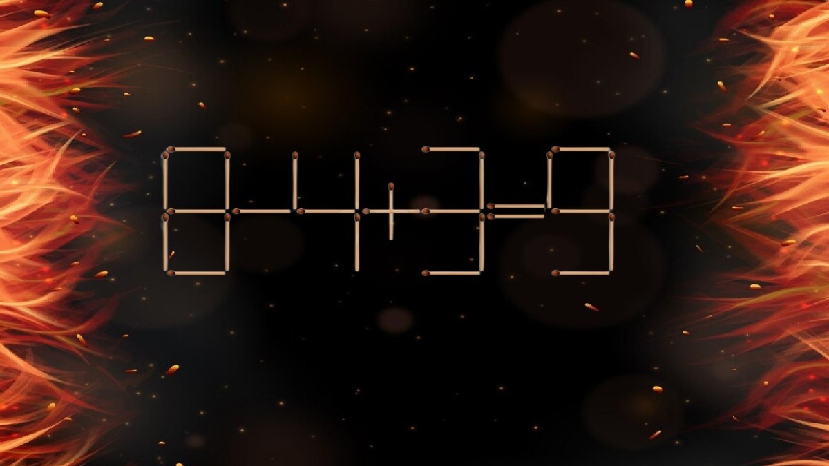 На иллюстрации показано равенство, в котором допущена ошибка. Переставьте всего одну спичку в записи «8-4+3=9», чтобы пример решался верно. Убирать лишние элементы нельзя, потребуется мастерство комбинаторики.