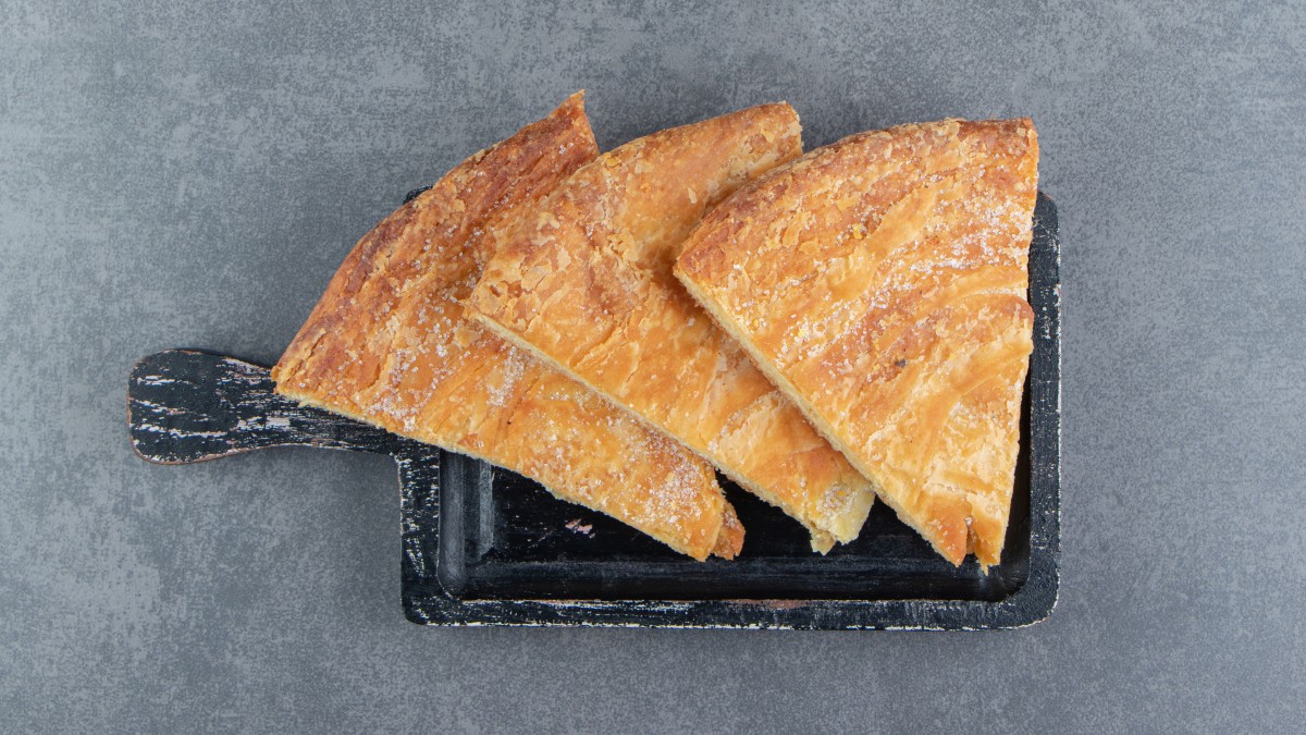 Как охладится, делим на три части наше тесто. Каждую часть в тонкий пласт. Пласты идут друг на друга и каждый ещё сверху сахаром посыпают. Сверху всё скалкой прижимают и нарезают на прямоугольники или треугольники.