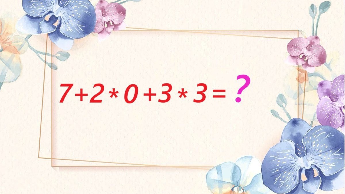 Предлагаем вам потренироваться на хитром примере, показанном на иллюстрации. Необходимо высчитать устно 7+2×0+3×3. Эти четыре действия определят не только ваши знания таблицы умножения, но и аккуратное обращение с порядком действий.