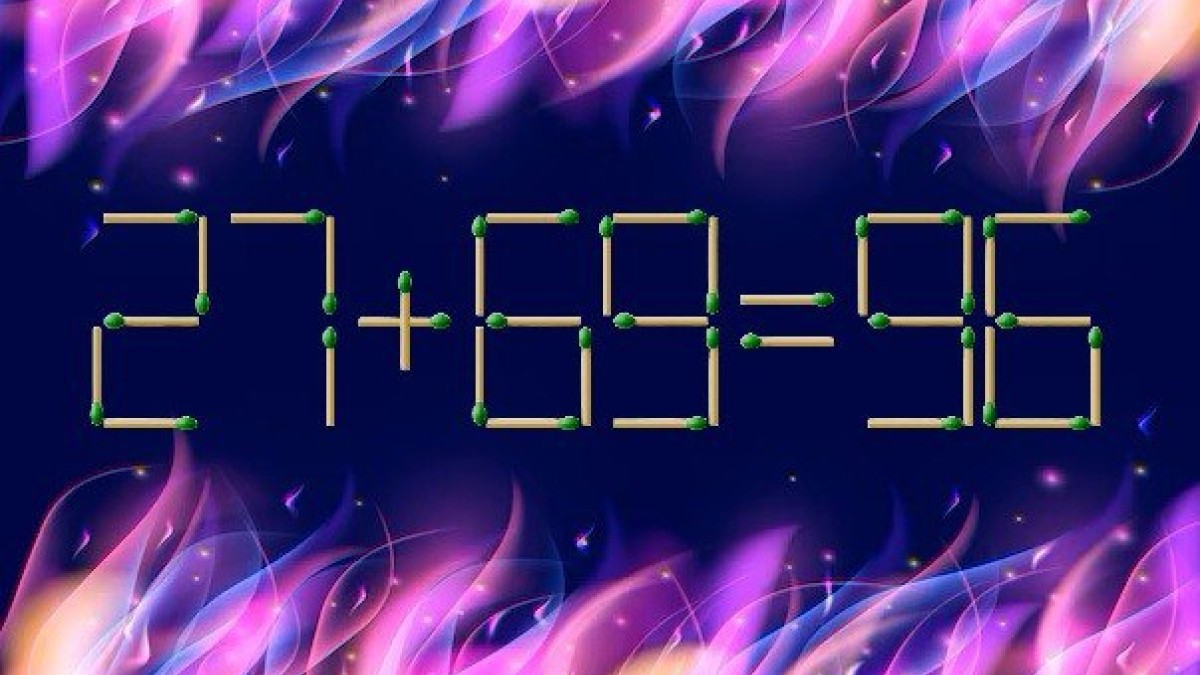 Представляем вашему вниманию классическую головоломку. На рисунке вы видите равенство «27+69=96», ошибку в записи поможет исправить перестановка всего одной спички. Творческое мышление поможет вам нащупать верный вариант.