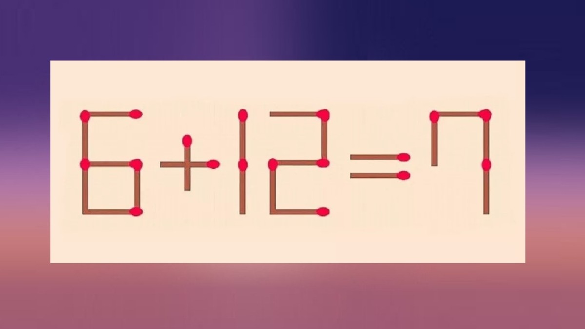 Представляем вашему вниманию спичечную головоломку, посмотрите на иллюстрацию. В равенстве «6+12=7» намеренно допущена ошибка. Подключите фантазию и выполните перестановку одной спички так, чтобы пример решался верно.
