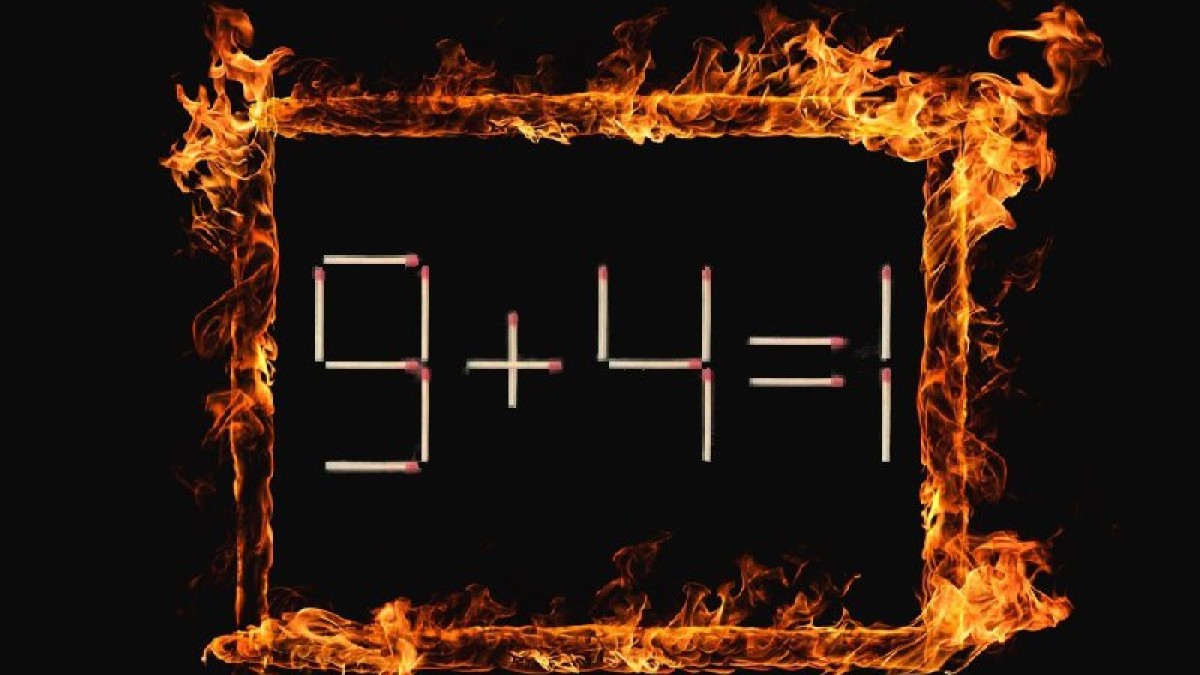 На иллюстрации показано равенство «9+4=1». Пример составлен неверно, ошибку необходимо исправить, передвинув всего одну спичку в записи. Остальные детали нельзя убирать или ломать, всё строго. Включите творческое мышление, оно пригодится.
