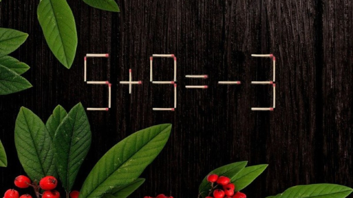 Взгляните на иллюстрацию, вот задание на проверку вашей сообразительности. Вы видите равенство «5+9=-3», содержащее ошибку. Пример несложно исправить, переместив всего одну спичку в записи. Докажите, что умеете творчески смотреть на картину жизни.