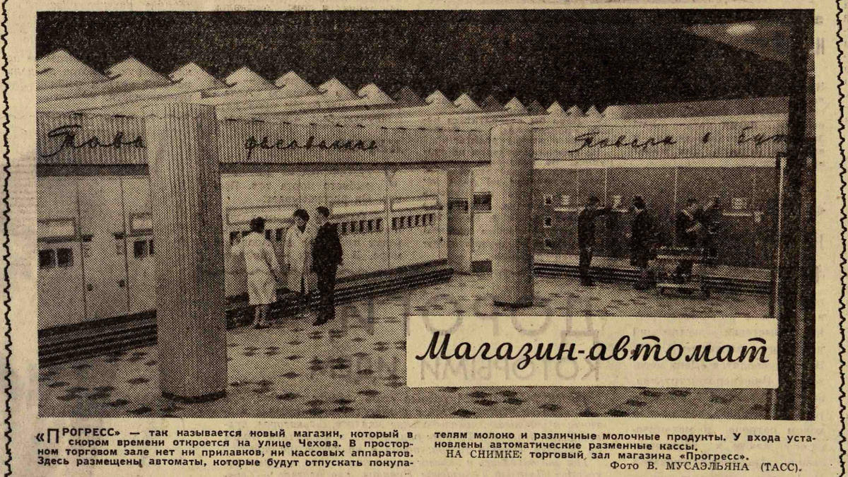 Идея создать магазин без продавцов появилась после визита Хрущева в США. Там он увидел торговые автоматы и решил внедрить нечто подобное в СССР. Так на Малой Дмитровке в Москве «Прогресс».